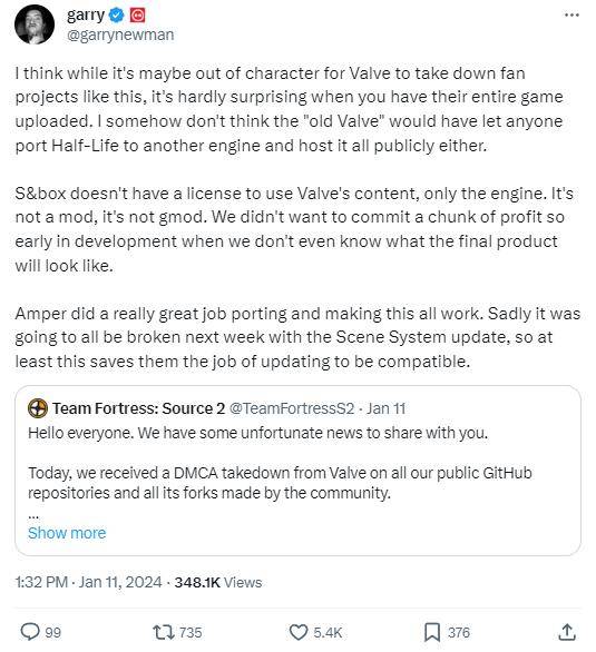 按照V社以往对于玩家社区的宽容,一次压下两部玩家作品看起来有些令人奇怪。Garry's Mod游戏作者Garry也在社交媒体上就此事发表了看法,首先《军团要塞:起源2》本身几乎是完全重制的游戏,而V社的《军团要塞2》还在运营,应该并不会放任该作品发布。另外Amper Software方面也表示游戏因为各种原因,早在去年9月就陷入了停止开发的状态,收到V社的DMCA通知只是“棺材上的最后一颗钉子”罢了。