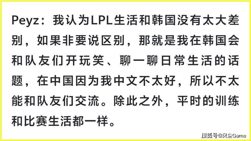 除此之外,Peyz还被问到LPL和LCK赛区,生活上的差距,Peyz表示:LPL生活和LCK,没有太大差距,非要说区别的话,就是在LCK会跟队友们开玩笑,聊一聊日常生活,在LPL因为中文不好,所以不太能跟队友交流,只来了一个赛季,回去居然没吐槽,看得出来,Peyz确实有教养。
