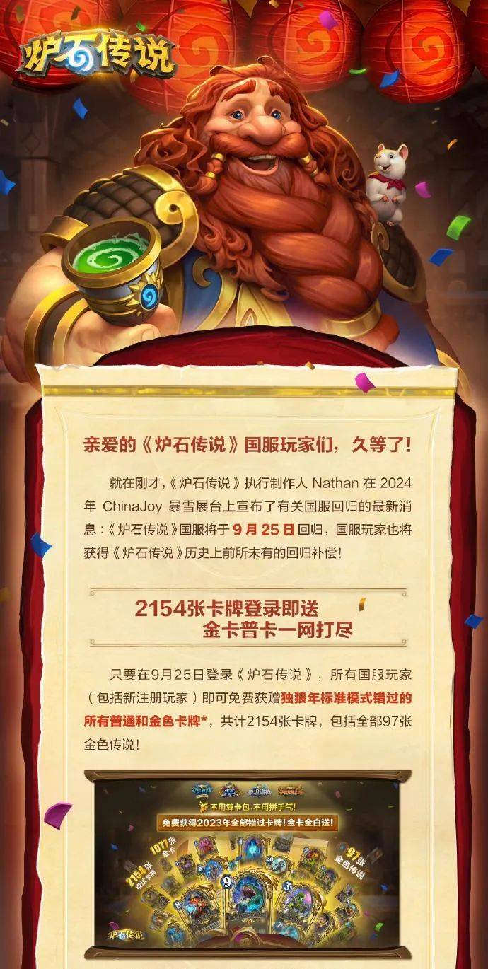 昨天的新闻,但不得不提一下,《炉石传说》国服将于9月25日回归。回归补偿包含2023年全部卡牌,两千多张卡牌,包括全部97张金卡统统白送。