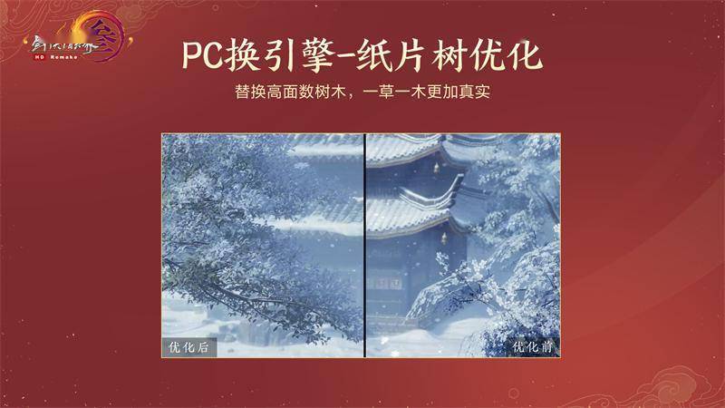 除了以上的多项优化,大家一直吐槽的纸片树也会更换为面数更多、精度更高的树木,且作为高清资源提供,侠士们可以自行安排选择性下载。基于这些技术,我们对于资源的翻新与重组计划也在进行中,旗舰画质beta只是一个开始,运用诸多技术打造水墨国风场景的脚步仍在持续迈进!