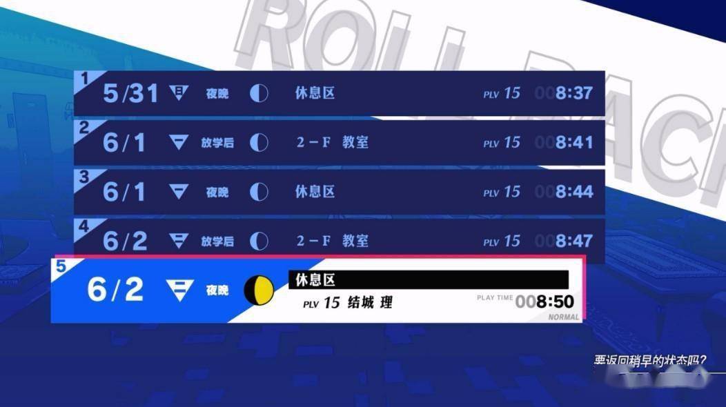 《P3R》还新增了一项十分好用的新功能:“Rollback”回滚系统。简单说,就是它会在每个新的时间节点自动存一次档,而如果你发现自己不小心行程搞错了,或者对话选错了选项,就可以直接回滚到上一个时点,而不必担心着随时都要存档来以防万一。鉴于《P3R》许多对话分支和活动都被重做,Rollback系统在你开荒的过程中也将会变得无比实用。