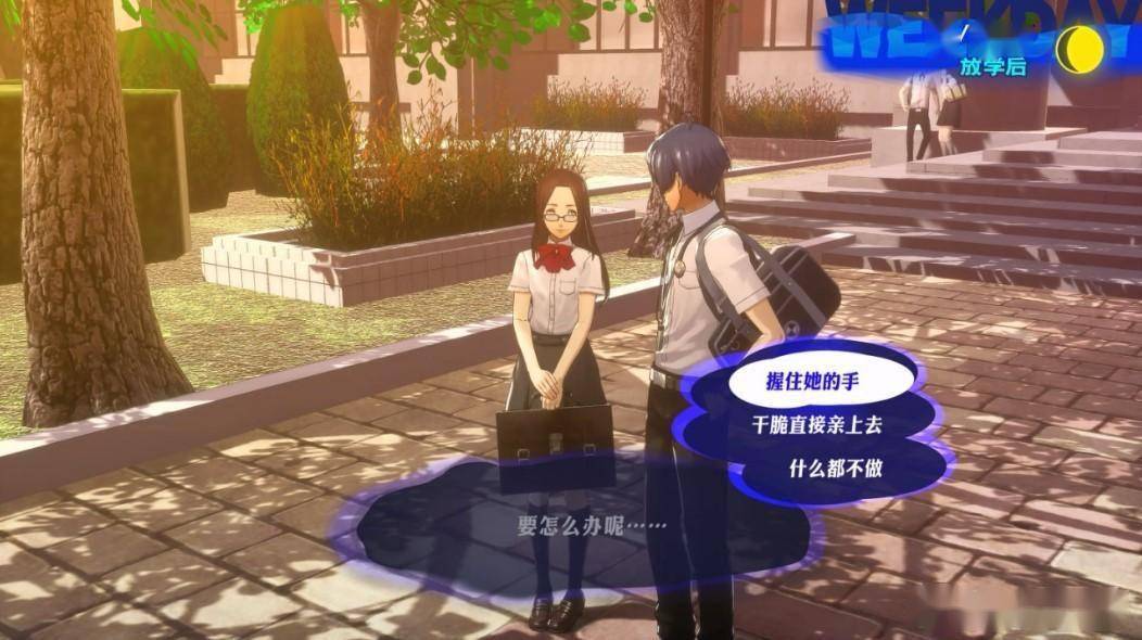 有不少同伴们的COMMU对话都加入了全语音,而我在游玩过程中,还发现伏见千寻的COMMU在进度过半时,出现了类似于《P5》的恋爱/普通关系线路分歧:如果你在千寻向你隐晦地表达好感时,否定了她的想法,那么这次COMMU对话也会就此结束,但如果你选择了另外的选项,那么就会触发特殊的后续——可以选择牵住她的手,让两人进入到特殊的关系阶段。