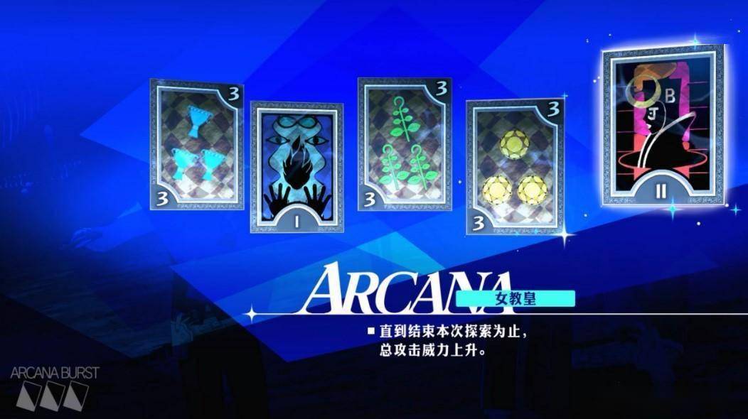 《P3R》也优化了战斗结束之后的抽卡环节,你现在不需要再从一堆乱飞的卡牌里随机抽卡,而是可以像《P4G》中一样,从固定的几张卡牌里自由选卡了。另外,卡牌中还新加了像愚者、魔术师这类的大阿尔卡那塔罗牌。随着攻略进度大阿卡那塔罗牌会不断增加,且在一次探索中收集齐全之后还能发动“阿尔卡那爆发”,强化获得的效果。