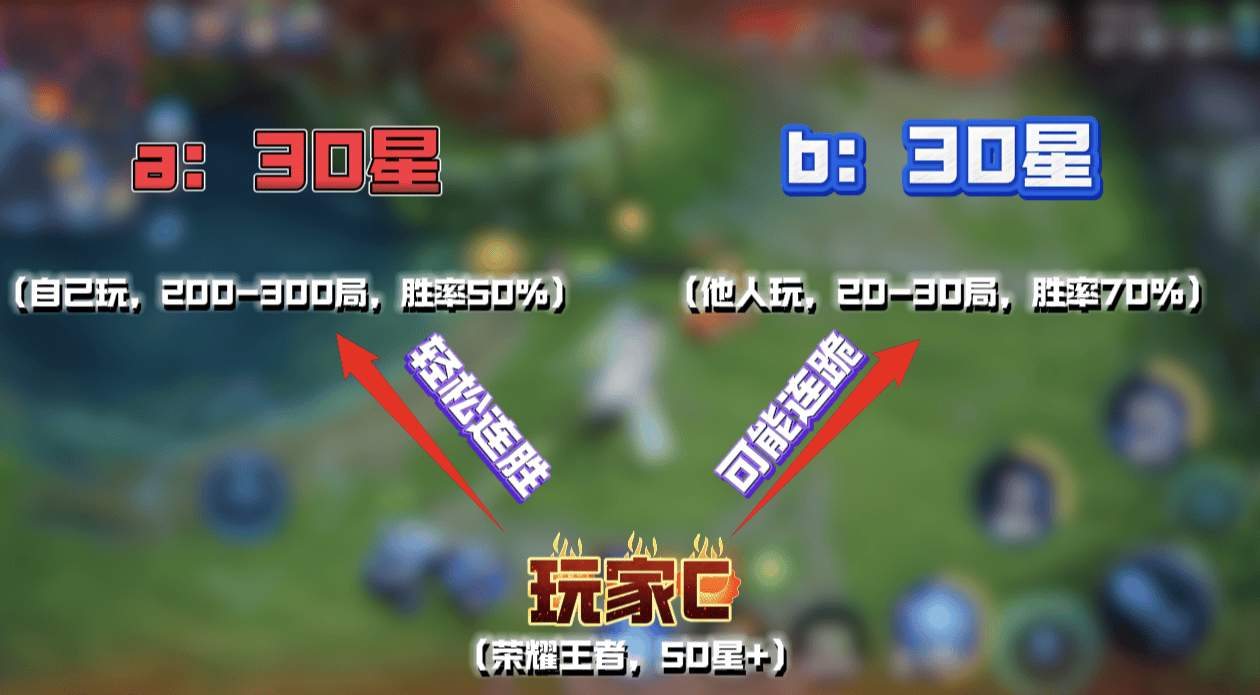 那么这种情况下,我们假设c他的段位是荣耀王者,也就是50星以上,他去玩a账号可能上分效率会很高,也能轻松打出连胜,但他去玩b账号很有可能会出现连跪情况