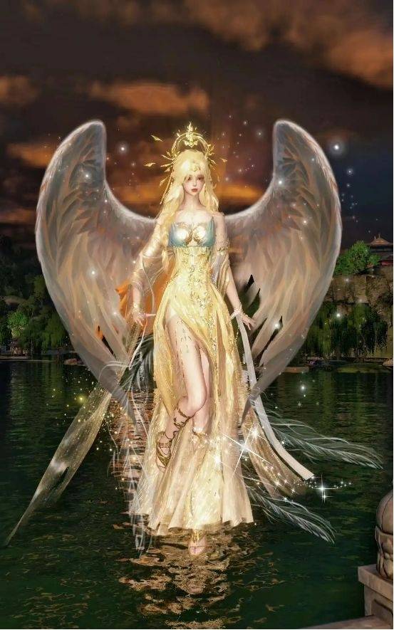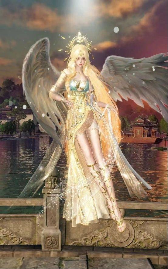 在大多数人的认知里,天使的身体和人并无太大差别。她们有着一头瀑布般的金色长发,头上顶着一个光环,背上有一对美丽的白色羽翼,总是让自己的双脚暴露在空气之中。同时,周身散发着白色的光芒。而这样的天使造型,玩家们在游戏中可以轻松还原,只需要在P图的时候多下苦功即可。比如最新的太阳神发型,这一头渐变的如瀑长发就很契合金发天使的形象。