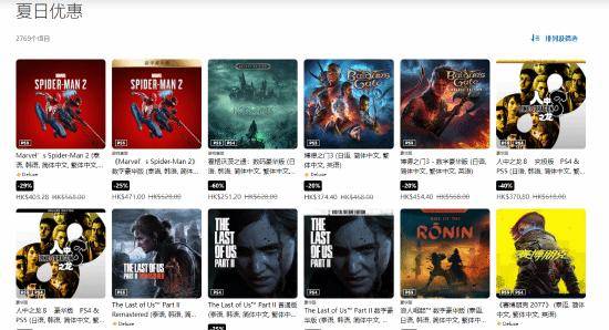 《浪人崛起》《如龙8》终极版《漫威蜘蛛侠2》《博德之门3》《最后生还者2复刻版》《赛博朋克2077》《战神诸神黄昏》共2769款游戏及追加内容参与了本次活动,截至8月14日,最低可享受三折优惠。