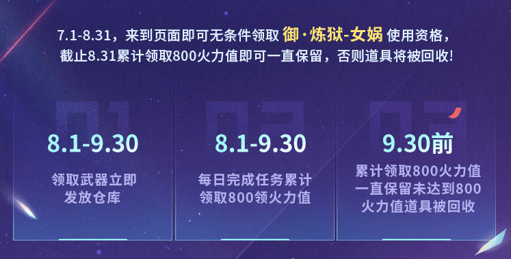 2024年8月1日—2024年9月30日期间来到页面可以无条件领取,而且武器会立即发放至游戏仓库,活动期间累计800火力值即可一直保留该道具。