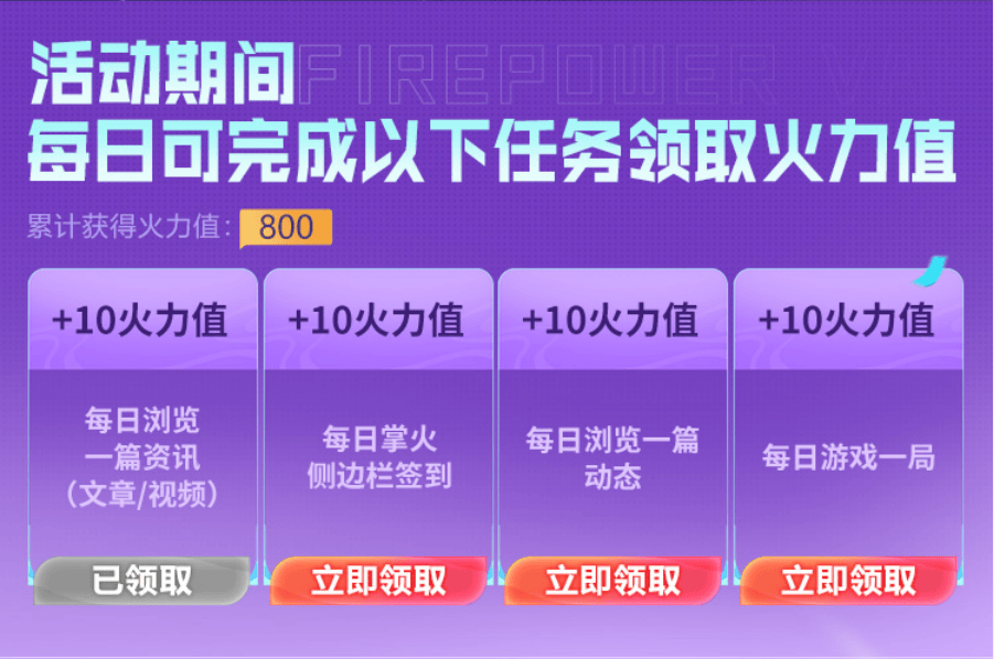 火力值任务共分为四个,每日均可完成一次,且每日最高获得40火力值。其中的任务难度较低,只需在掌火内签到、浏览资讯和动态等,即可完成!