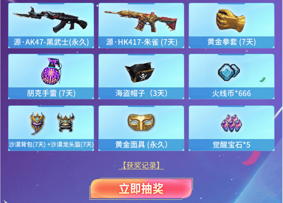 与此同时,通过任务获得的火力值还可参与“火线夺宝”获取专属奖励!每次夺宝会消耗40火力值,且每月抽奖上限次数为12次。本期奖池内含:源·AK47-黑武士这款武器的无期限版本,也包含有黄金面具、海盗帽子及沙漠龙头盔+背包等。