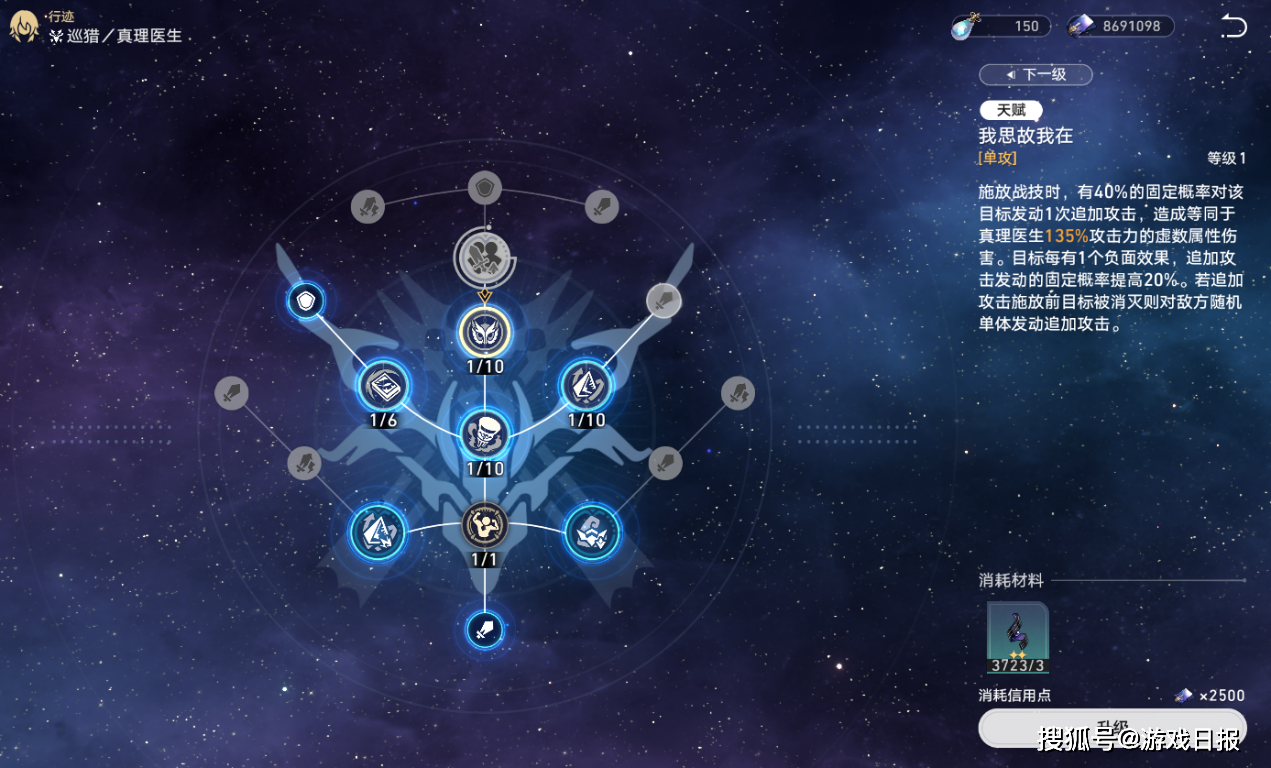 先来看这位新角色的定位,真理医生,虚数巡猎角色,一个典型的对单特化角色,适合作为副C或主C使用。真理医生的输出来源主要基于他的天赋“我思故我在”,该技能让真理医生在全队角色释放战技时有40%概率触发一次追加攻击,敌人身上每有一个负面效果再提20%的概率。
