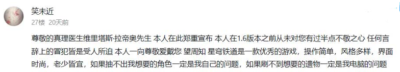 真理医生确实又强又有趣,那为何这个角色会白送呢?或许米哈游真的很在乎玩家的游戏体验。《崩坏:星穹铁道》来到1.6版本后,真理医生没进入卡池之前,虚数角色一共也就4位,这其中两位限定五星,暂时已经抽不到了。在这样的情况下,玩家面对虚数属性的敌人时多少有点吃力。官方此时送一个真理医生,完美解决了玩家的痛点,看看自前瞻公布以来玩家们的反应,崩铁的运营,算是把玩家拿捏得死死的。