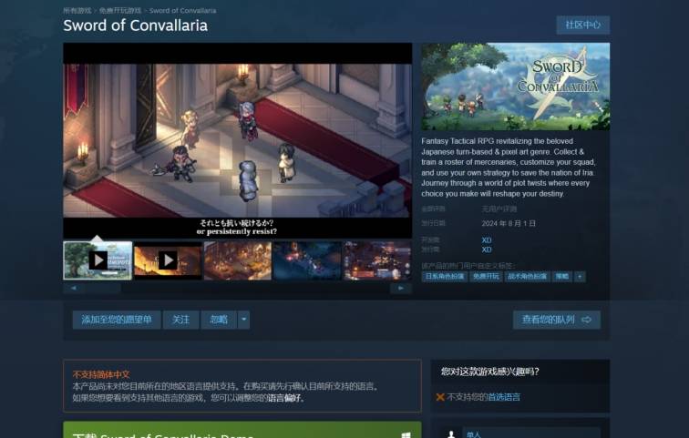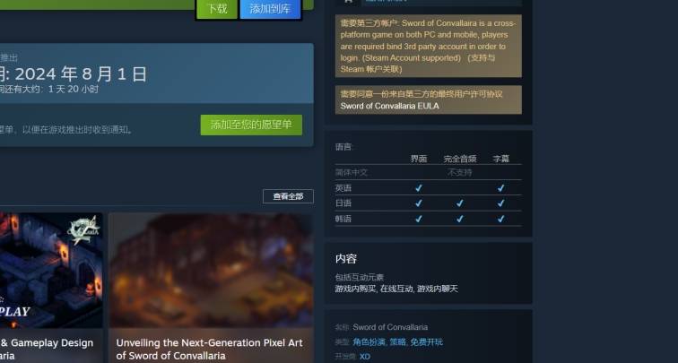重新启动steam,搜索【Sword of Convallaria】就可以进入铃兰之剑国际服的steam页面了,点击【添加到库】即可。