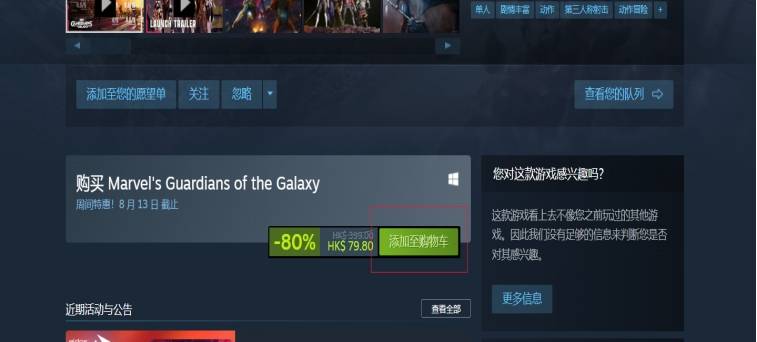 加速成功后,打开steam商店,点击一款需要购买的游戏,点击【添加至购物车】。
