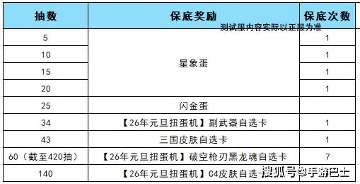 本次活动的具体的保底机制为:第5/10/15/20抽必得星象蛋;每25抽必得一枚闪金蛋,且获得炫闪·G3A3-凤雏的概率大幅提升;第34抽必得【26年元旦扭蛋机】副武器自选卡;第43抽必得三国皮肤自选卡;每60抽必得【26年元旦扭蛋机】破空枪刃黑龙魂自选卡,截至420抽;第140抽必得【26年元旦扭蛋机】C4皮肤自选卡。