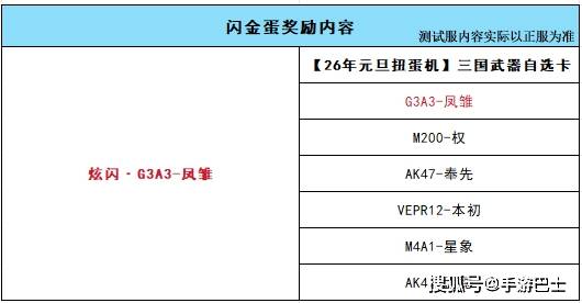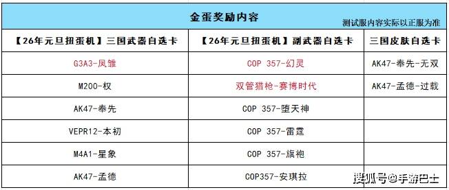 金蛋中惊喜满载,包含【26年元旦扭蛋机】三国武器自选卡、副武器和三国皮肤自选卡,大家可以从自选卡里畅选备受关注的G3A3-凤雏、双管猎枪-赛博时代和COP 357-幻灵等武器。