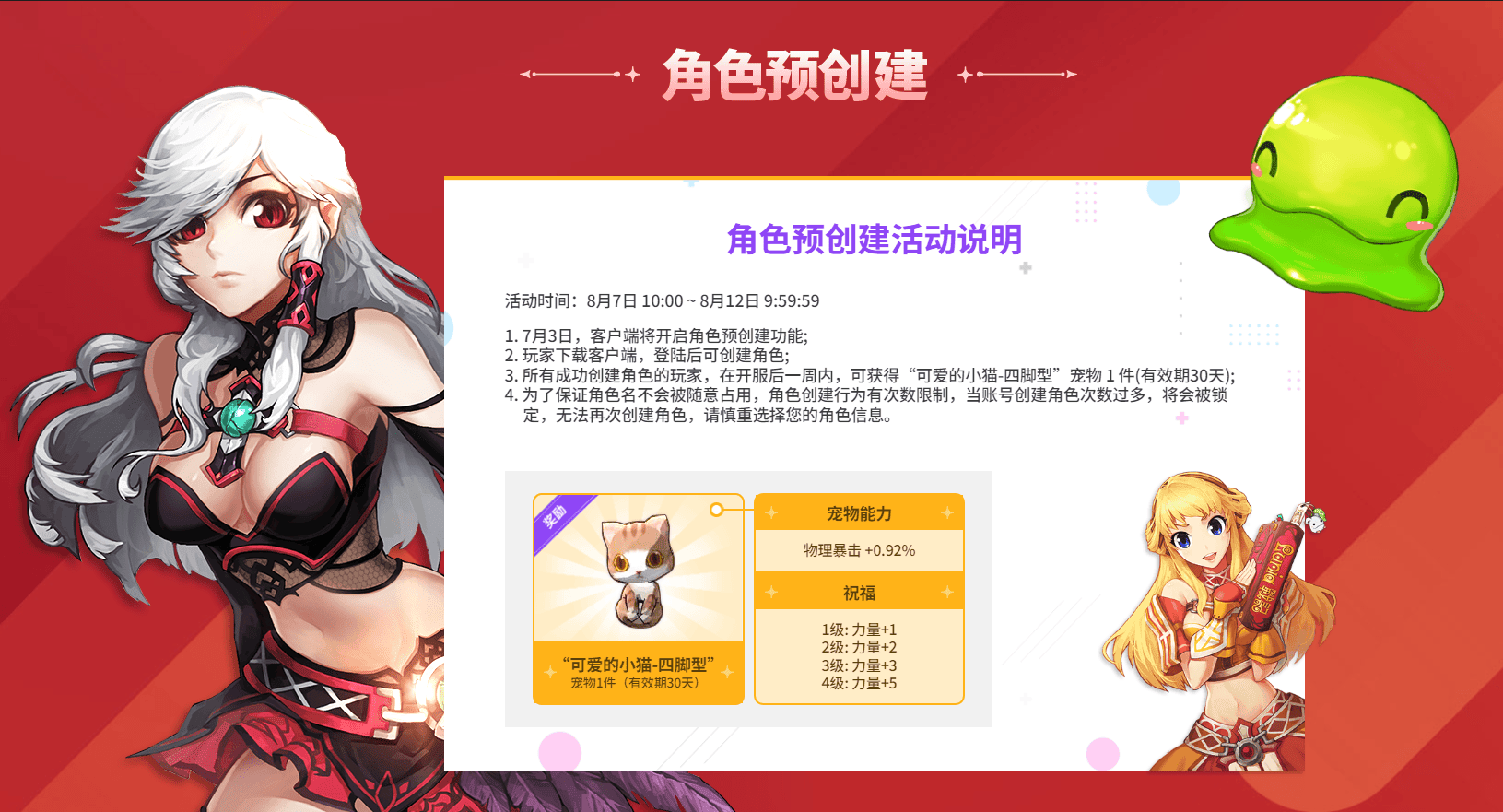 8月7日,参与了角色预创建的玩家,还将在开服后的第一周内,获得提供物理暴击加成与力量祝福的“可爱的小猫-四脚型”宠物一只,为你的冒险之旅增添一份温馨与助力。