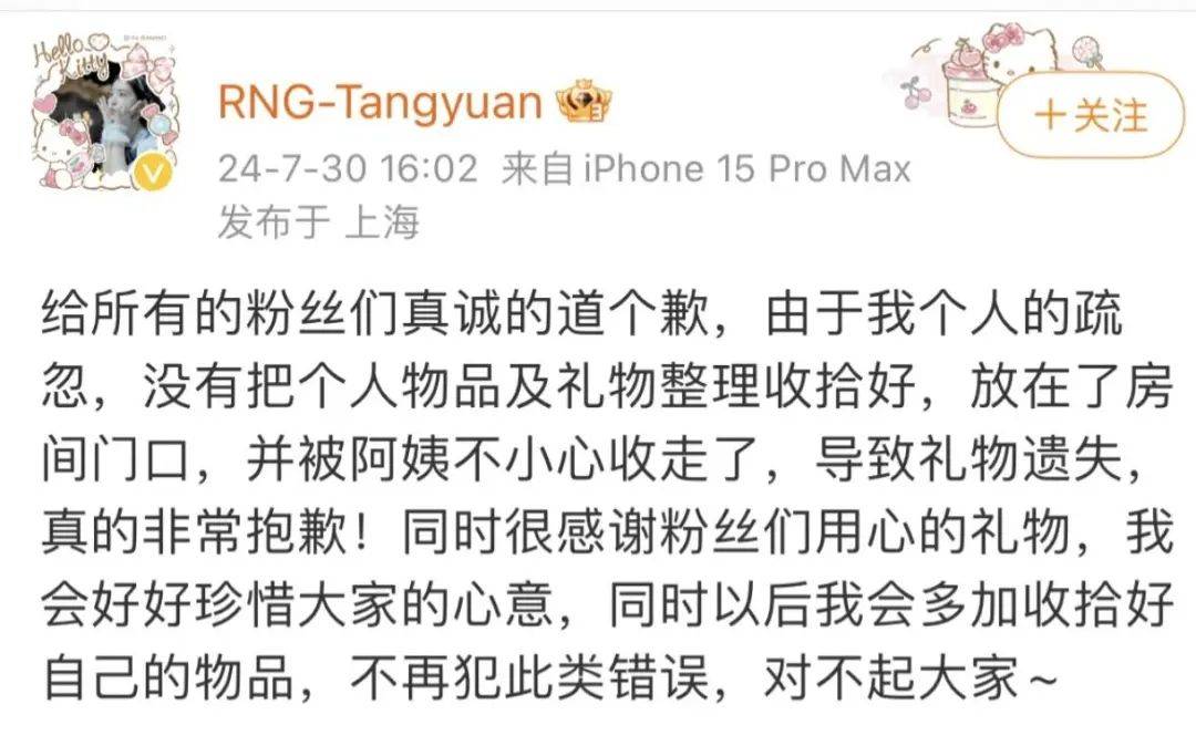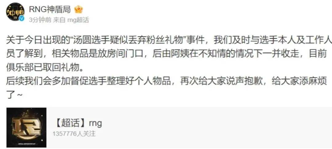 然后晚些时候,RNG官方和汤圆就先后发声了,说法都是差不多的,汤圆这边向粉丝道歉,说是因为个人的疏忽没有把礼物整理收拾好,不小心放在了门外,被阿姨直接收走了,RNG的说法也是差不多。