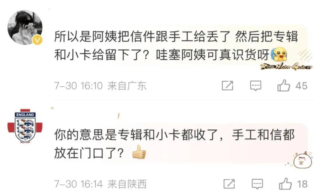 这样的解释观众们必然是不能满意的,直接开始炮轰汤圆和RNG战队,本质就是把锅甩给了阿姨,按照汤圆的说法,事实很有可能就是汤圆拿到礼物之后发现了其中最为珍贵的东西是专辑,然后把专辑拿走之后,随后将剩余的礼物扔在了房间外面。
