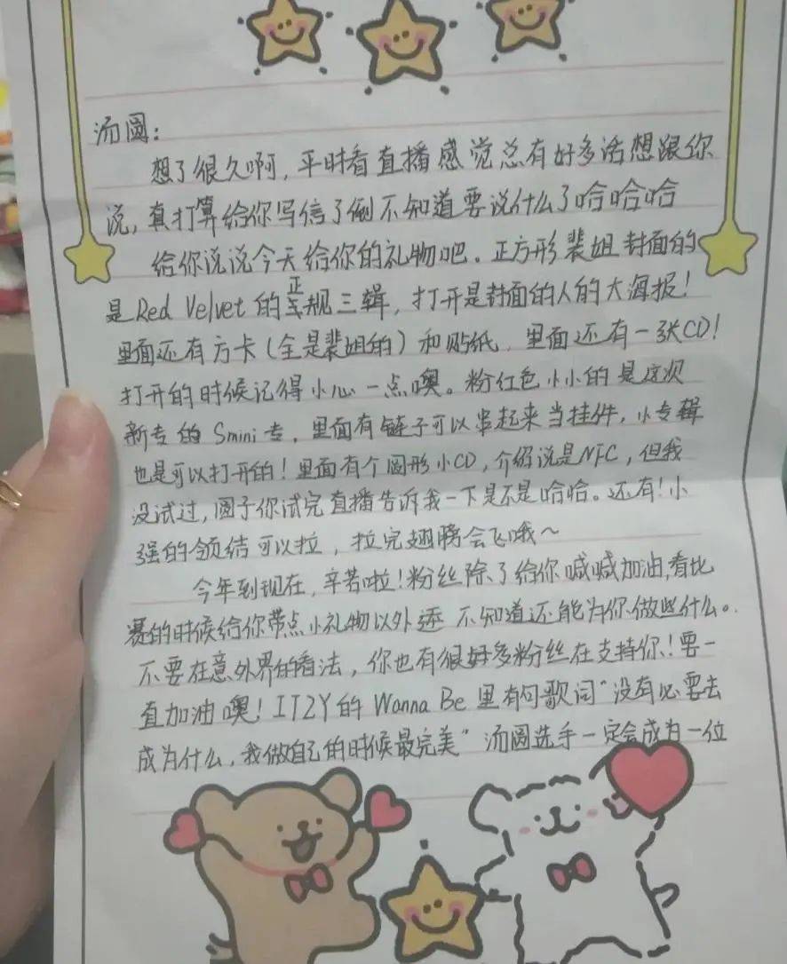 粉丝信件的内容差不多是这样,有粉丝送给了汤圆韩国女团Red Velvet的专辑,这个女团里面比较知名的明星就是裴珠泫,相信很多观众都比较熟悉了,这个粉丝是送给汤圆专辑,应该是比较珍贵的,然后是一系列小物件再加上这一封信。