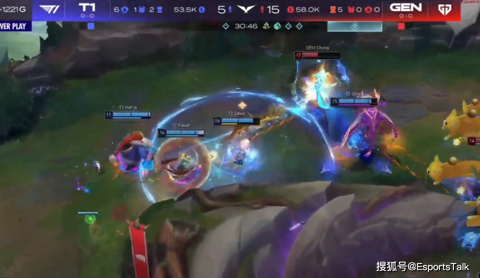 决胜局T1这个阵容选的太飘了,开局keria就被一级团抓死,后续GEN持续在下路给压力滚雪球,oner的蝙蝠也是未能在前期打出什么效果,GEN在前期就打出了5-0的美妙开局,中期T1已经有点乱了心神了,上路那波强抓chovy未果直接导致己方大败而归,而oner这个虚空鱼完全就是熟练度不够,成了负作用。