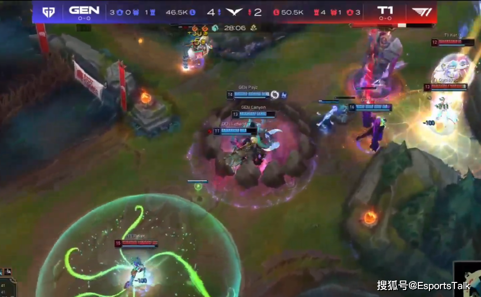 龙魂团,oner神来一笔的绕后将peyz踢到Faker大招范围,GEN被瞬间而来的团战再次打晕,T1完成了一波大胜顺带断掉了GEN的龙魂节奏。后续Faker再次在中路完成了一波帅气开团,只可惜这一次因为跟队友脱节太多被击杀,GEN抓住机会直接大龙逼团,虽然大龙成功拿下了,但Gumayusi也是配合队友击杀了GEN四人,并且再次拿下小龙,只可惜这波大龙buff还是帮助GEN完成了推进,加上chovy小炮已经成型,双射手的优势也是成功扳平比赛。