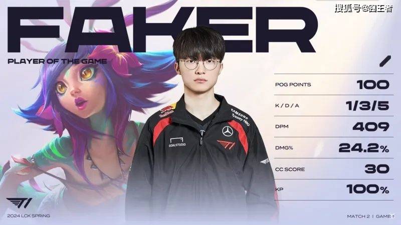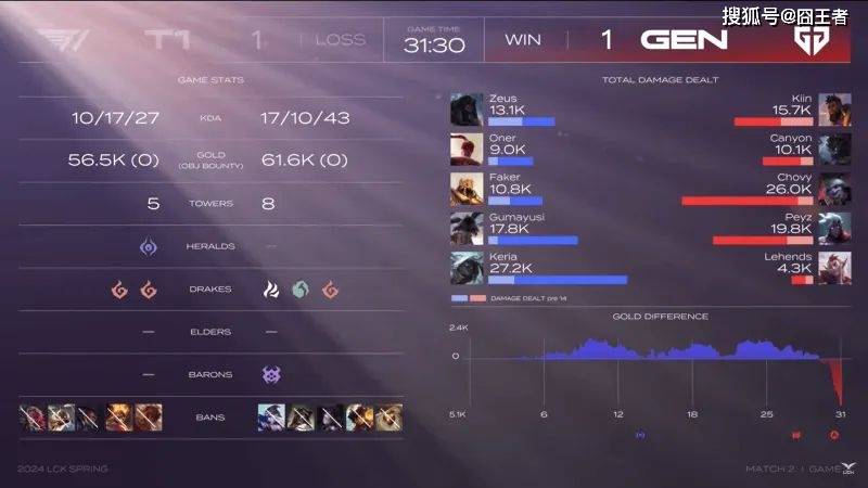 结果第一局比赛,双方仅在前10分钟打得有来有回。从第15分钟开始,T1就利用更加有容错率的传统阵容,辅以娴熟的运营,逐渐拉开差距,但优势不大。真正的转折点出现在22分钟以后,T1先是抱团拿下大龙,扩大经济领先,在第28第分钟,Faker妮蔻绕后大三个后,T1瞬间打出0换4,宙斯格温砍下三杀后,T1一波先赢一局。