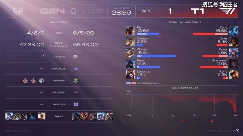 结果双方在决胜局中,打出了极其精彩的对局,总结起来是这样的:开局阶段,T1野辅连续被击杀,GENG在前10分钟,就打出6杠0的天胡开局,完全占据主动。天崩开局的T1,一路艰难抗住GenG的滚雪球,甚至在29分钟时,T1在上辅先后被秒的情况下,卑尔维斯面对GenG四人,勇敢的点果子神抢大龙,帮T1续了一波命,将经济差缩小到3000;