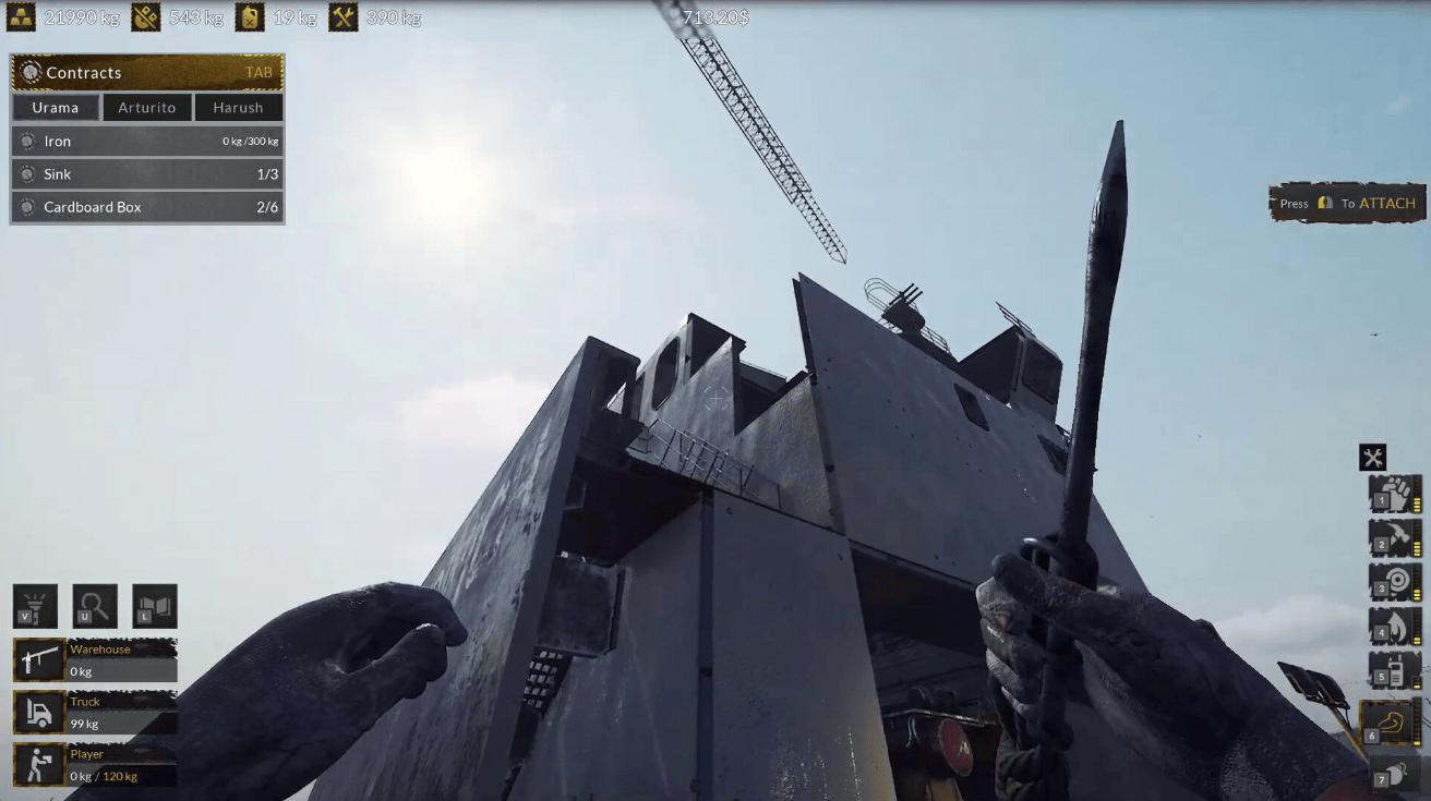 大气的场景,配合上“拆”的主题,真的很过瘾。很多游戏都称之为杀时间利器,本作是真正意义上的杀时间利器,它跟清理或者经营不一样。当你什么都不做,只是坐在电脑面前执行破坏工作,纯粹的破坏,就没有什么比这种行为更称得上杀时间了。但游戏内容并非是无脑破坏,需要玩家有条有序的执行拆除工作,例如:遇到大型船舶,单纯的蛮力破坏是行不通的,需要讲求方式方法,需要从内到外的一步步进行拆除,甚至在拆船的过程中还可能会遇到一些突发情况。游戏中提供的基础工具,如锤子、电锯和燃烧器供玩家使用,但随着大型船舶的到来,这还远远不够,需要使用塔吊和炸药。