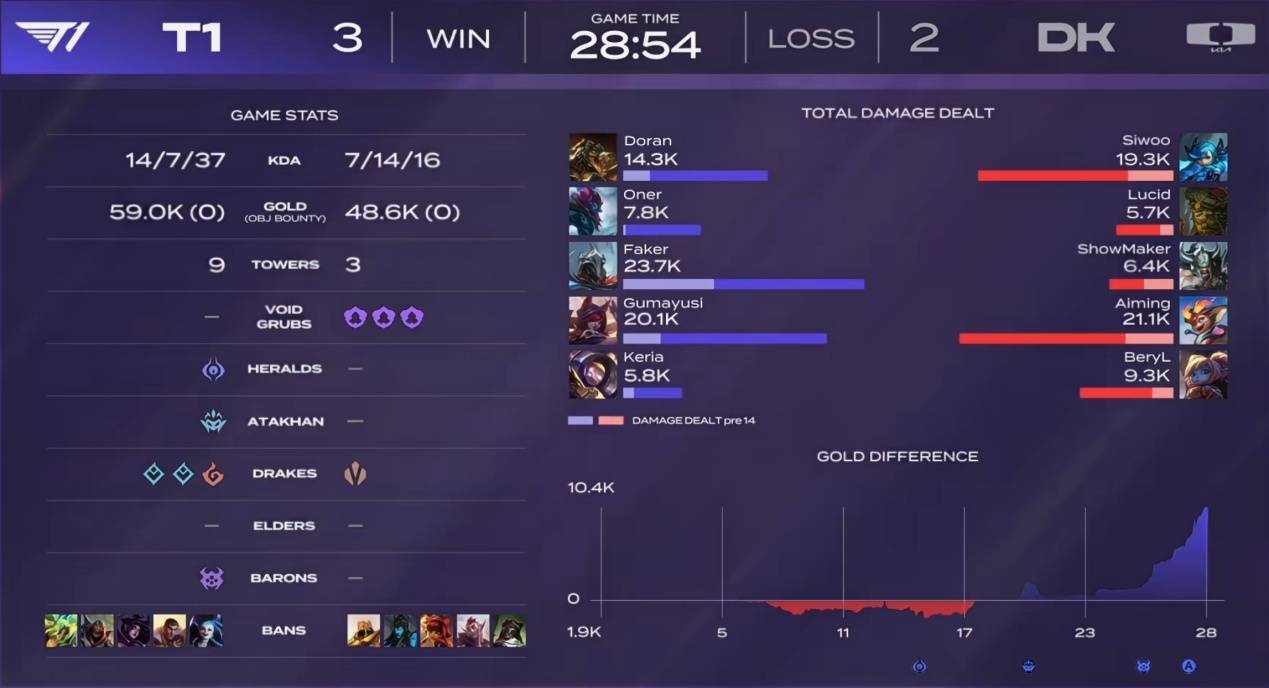 T1全队围绕Faker打,拆掉下路一血塔,但14分钟DK下路多人抓机会再杀Doran。