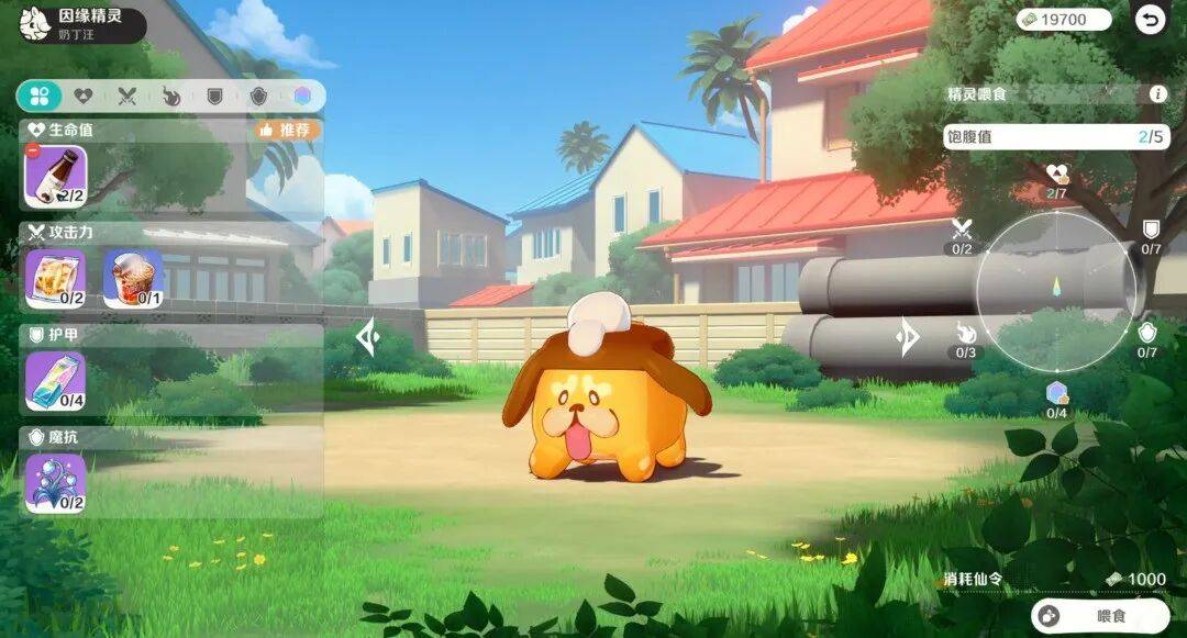 至少在这次测试中,精灵的养成做得很浅,精灵等级自动与角色等级对齐 (也就是世界等级),唯一需要玩家操作的就是一个喂食系统:喂对应食物提升对应的攻防属性。