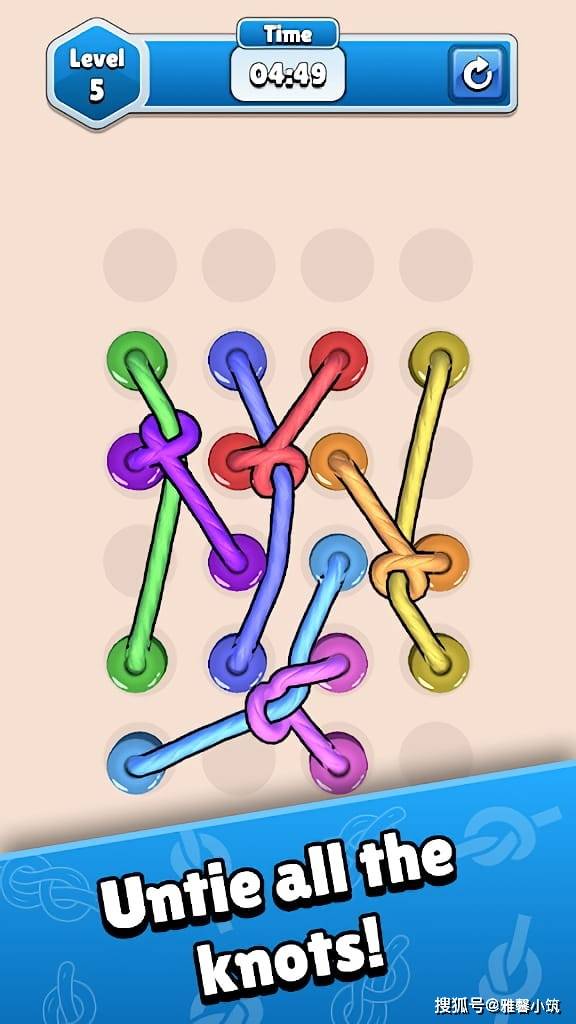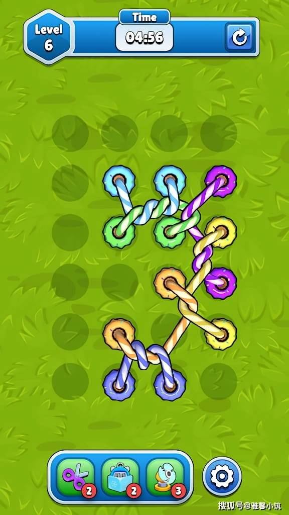 《Twisted Tangle》的玩法作为益智类游戏的拆解玩法,玩家需要在关卡中找出至关重要的初始绳结,在将其从诸多缠绕在一起的绳结中消除之后,即可开启自己的成功之路。逐渐将所有不同色彩,坐落在诸多位置的绳结一一击破,从而实现关卡目标,在有限的时间内通过关卡。虽然有着时间限制,但由于场景内的绳结点位有限,所有游戏的难度实际上并不是很高。