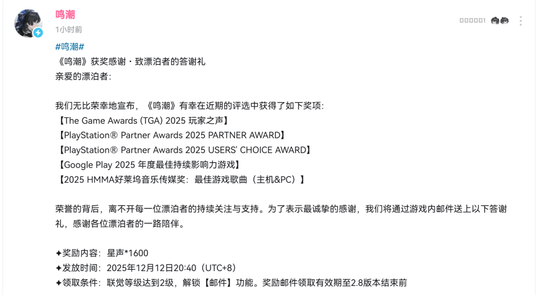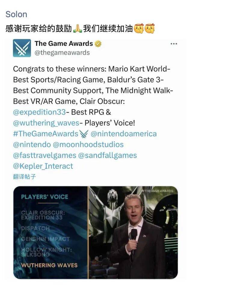 就在写这篇文章的时候,传来了一个消息:《鸣潮》刚刚拿下了2025 TGA的「玩家之声」。