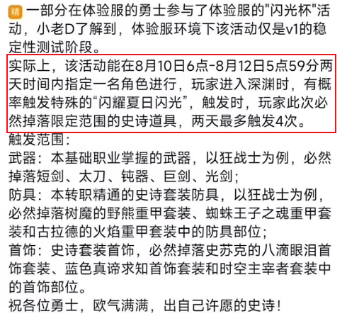 第三个:闪光杯后续活动,夏日闪光和深渊爆闪13次不重复。8月10-12开放夏日闪光节,进入深渊有概率触发活动,触发时必定掉落限定范围史诗装备,两天最多触发四次。
