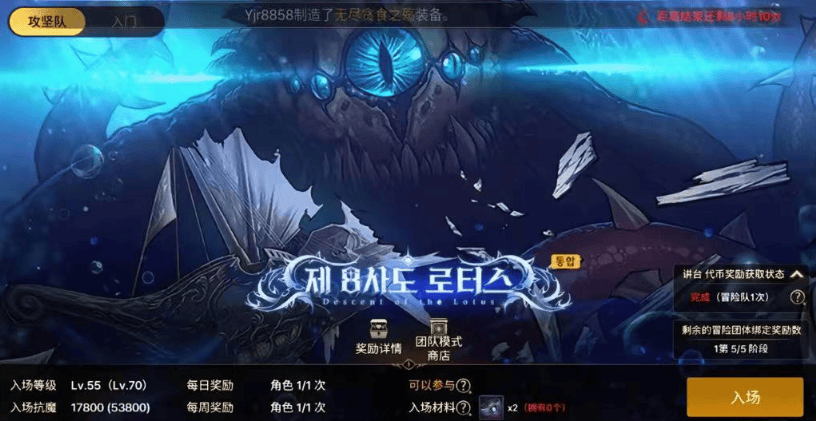 第二个:罗特斯困难团本上线。入门抗魔要求是17800,入场材料为两个干扰发射器,困难模式复活币使用次数为5次,奖励材料是普通团本武器的升级材料。所以大家可以按要求去提高抗魔或者选择刷还是不刷,如果连普通团本武器都没有的玩家,困难团本还是先放一放。