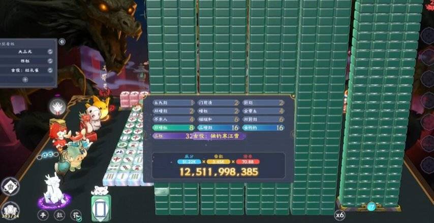 也就是说当构筑成型,凑满倍数和番数,甚至可以无限杠牌,杠到天上去,直接在对手面前砌墙,得分更是直接飙到几千亿,属于是整个人都爽麻了。