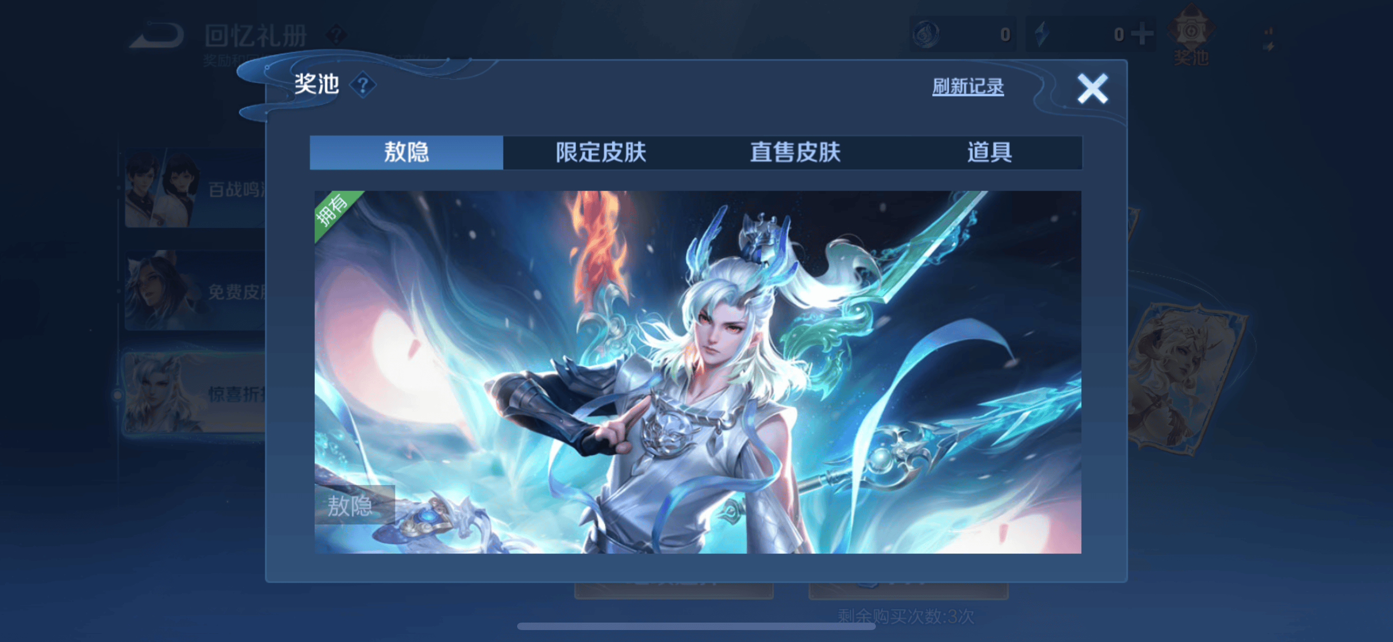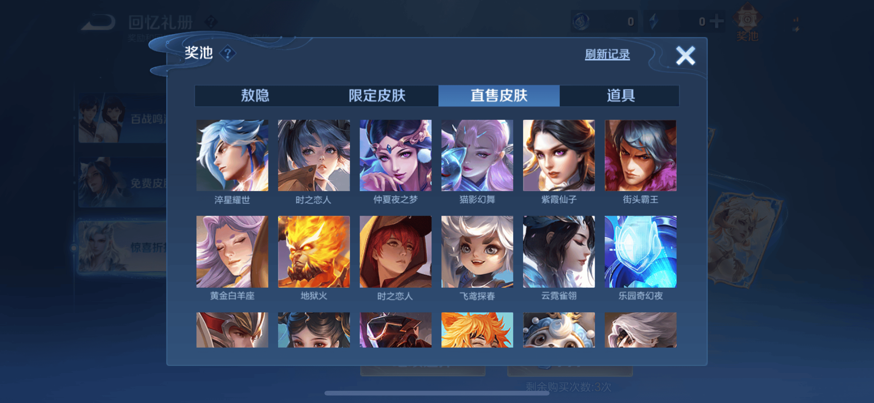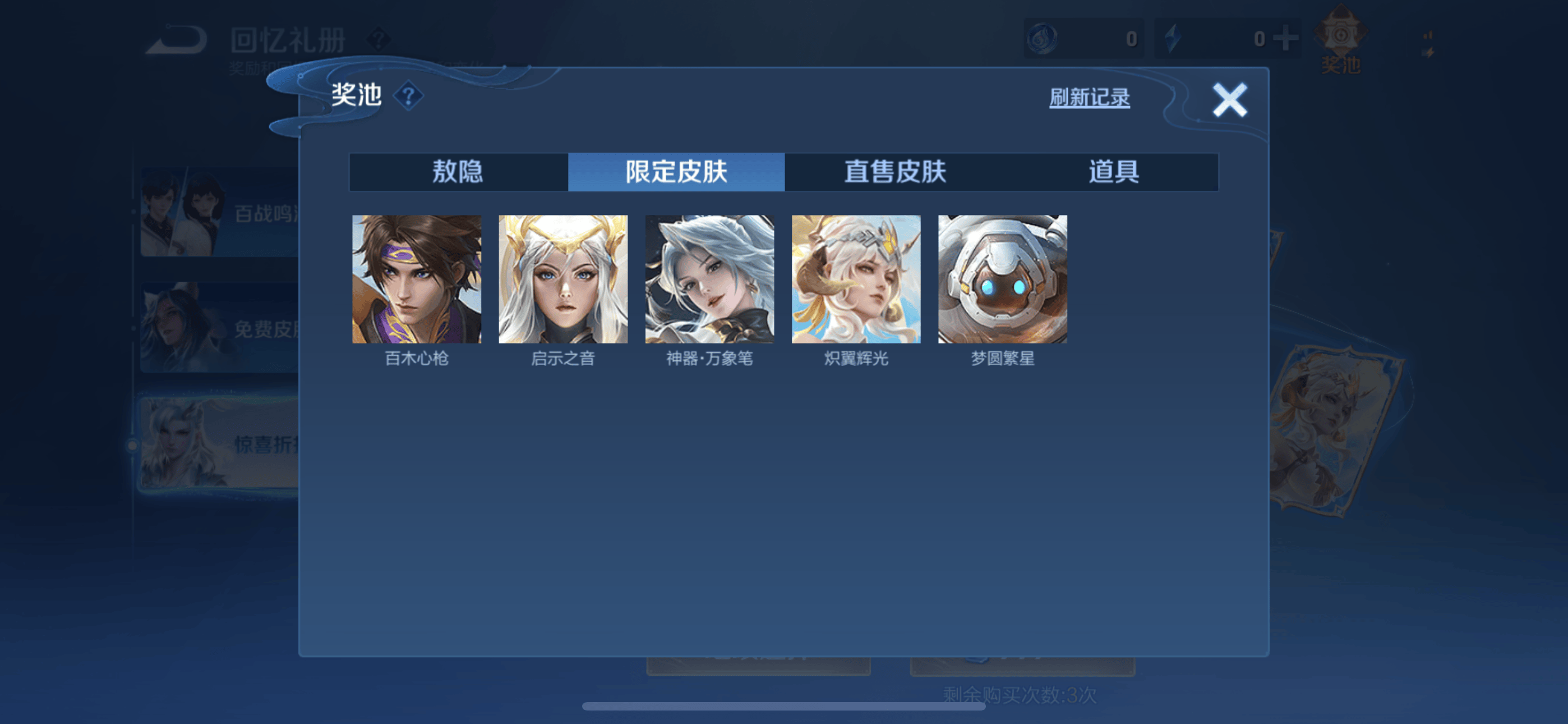 但大家有几点要注意的是!敖隐最低是388点券够买噢!限定皮肤的最低八折购买,而直售皮肤最低六折!购买次数不可以超过3次噢!
