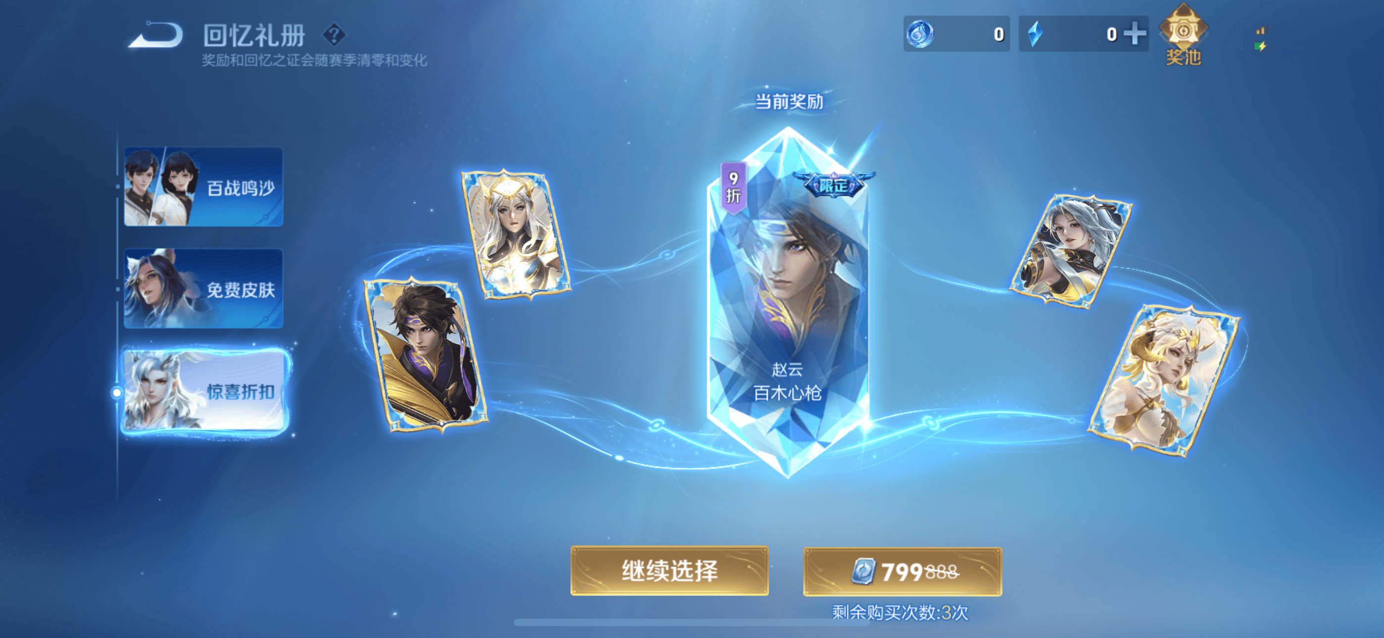 王者惊喜折扣奖池开放后,就可刷新到英雄敖隐、多款限定皮肤、折扣皮肤、积分夺宝抵扣券等惊喜折扣商品。其中,限定皮肤包含了赵云-百木心枪、露娜-启示之音、上官婉儿-神器·万象笔、伽罗-炽翼辉光、盾山-梦圆繁星。