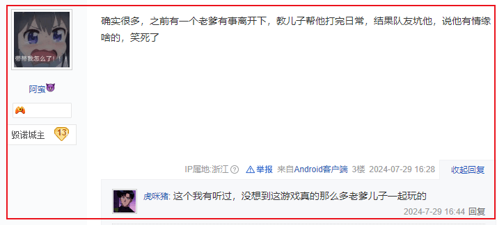 当这事被发到社交平台后,不少网友也表示在逆水寒游戏里遇到过很多“上阵父子兵”的故事,有父亲有事离开,就喊儿子帮忙打副本,还有人在麦里听到儿子教父亲放技能……