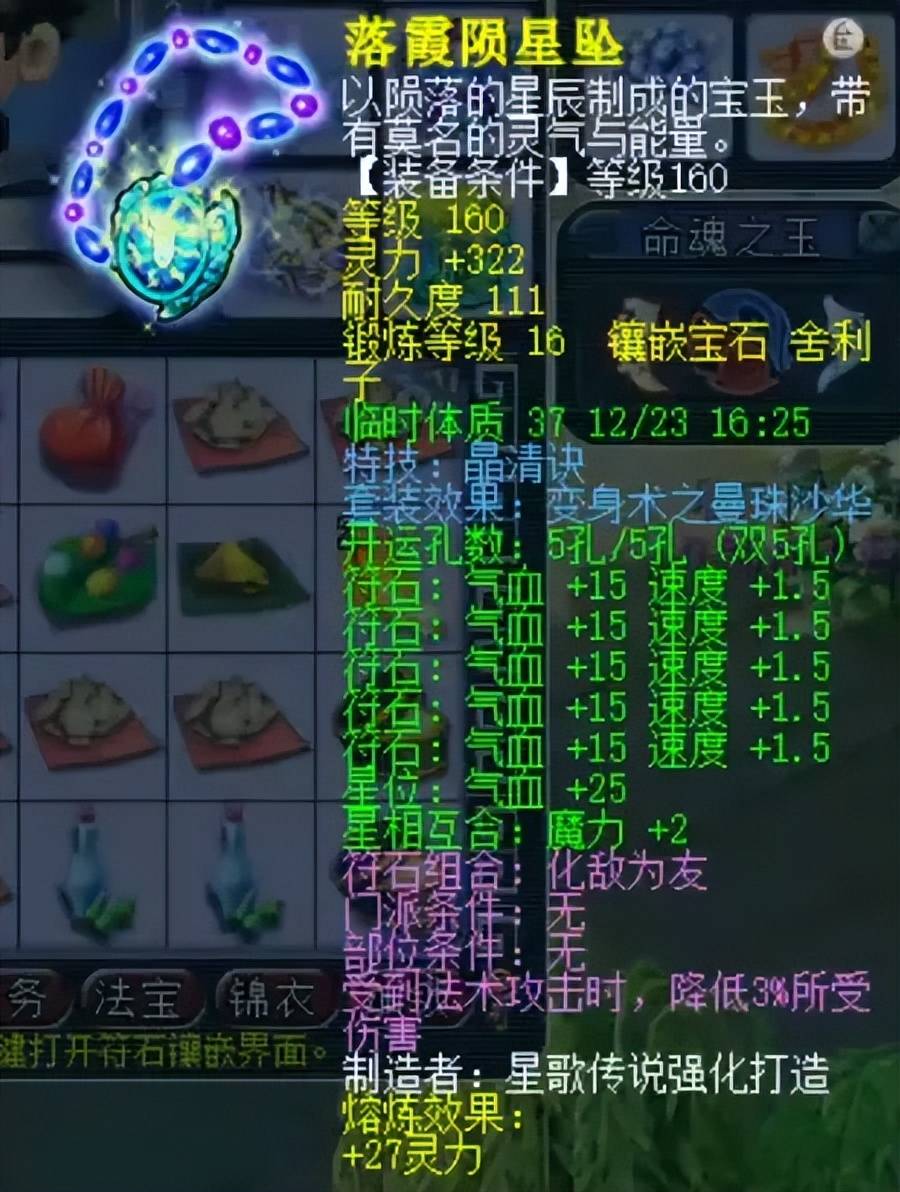 160级晶清项链,16锻舍利子+熔炼总灵349。高手核心大特技之一,用于全体解封或缓解血线压力。