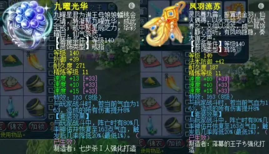六速度的140级前排灵饰。戒指主属性防御39爆11,下排速度共38爆8;耳饰主属性法防42满属性,下排速度共35爆5。