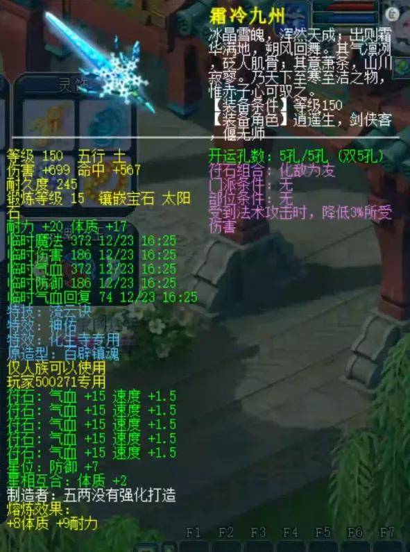 150级耐体双加54的神佑流云剑(原造型巨剑),15锻太阳石伤害699。不仅可以获得阵亡时概率复活的能力,还可以用特技抢速度优势。