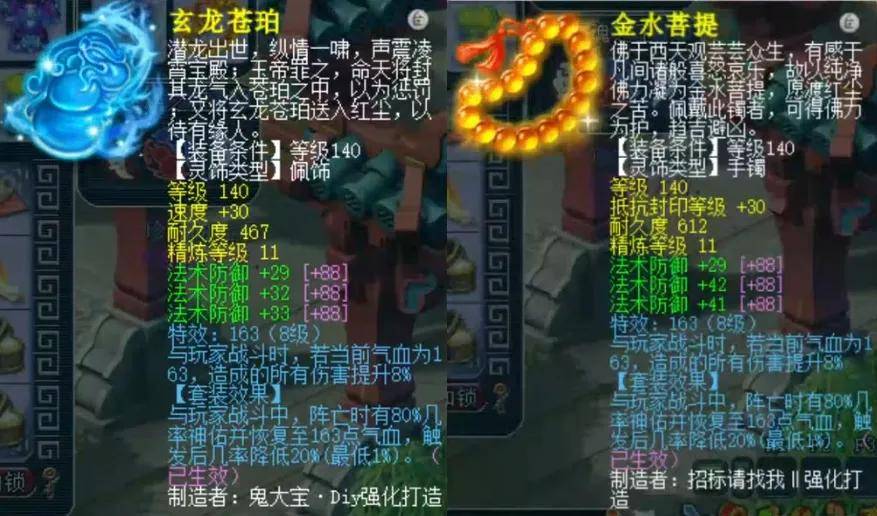 六法防的140级前排灵饰。佩饰主属性速度30满属性,下排法防共94爆10;耳饰主属性抗封30爆2,下排法防共112爆28。