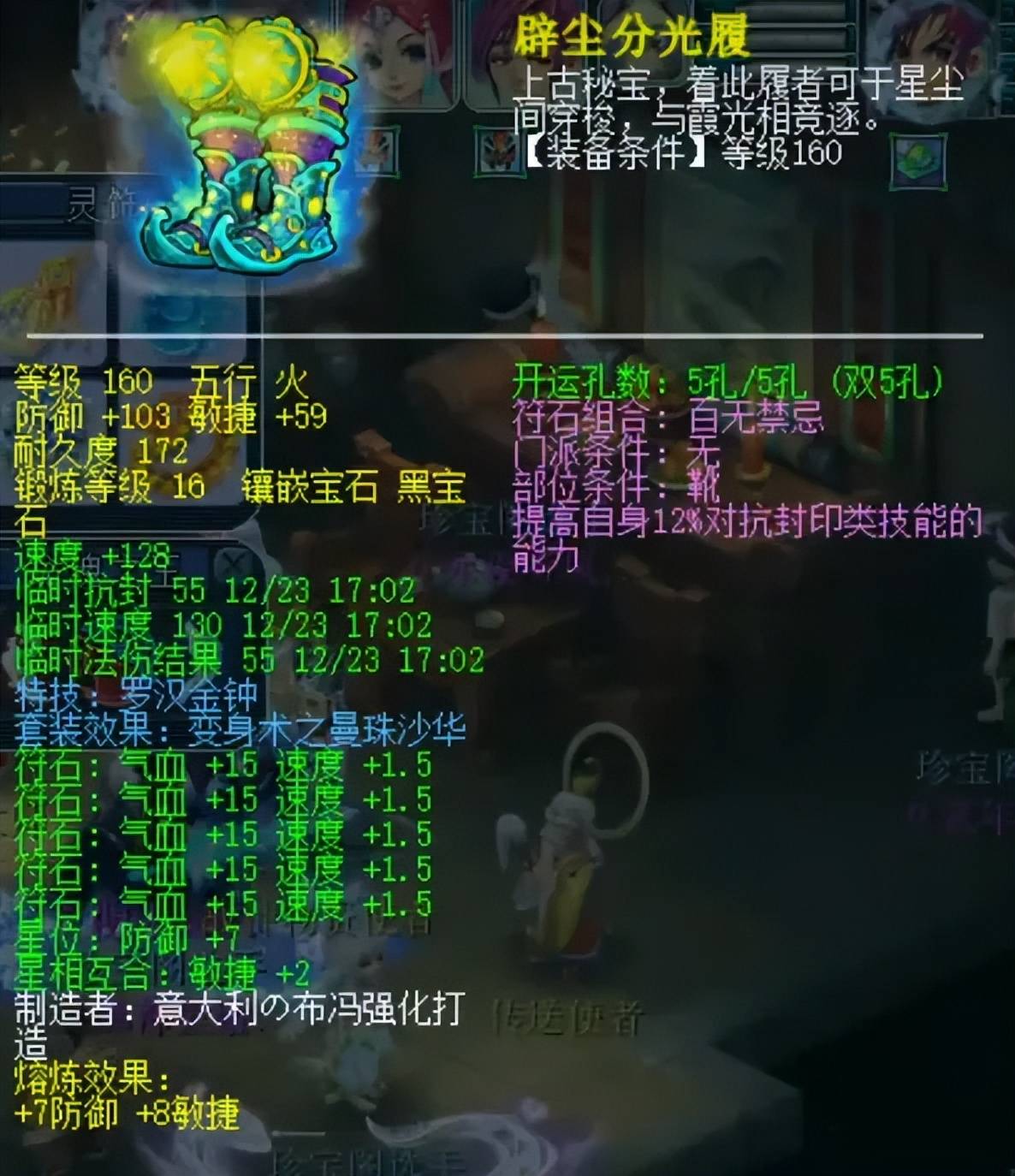 160级罗汉鞋子,熔炼后防御110、敏捷67,镶嵌16锻黑宝石。罗汉可减免一半法伤输出,常用于抵抗法系面伤以及法谛听冲刺。