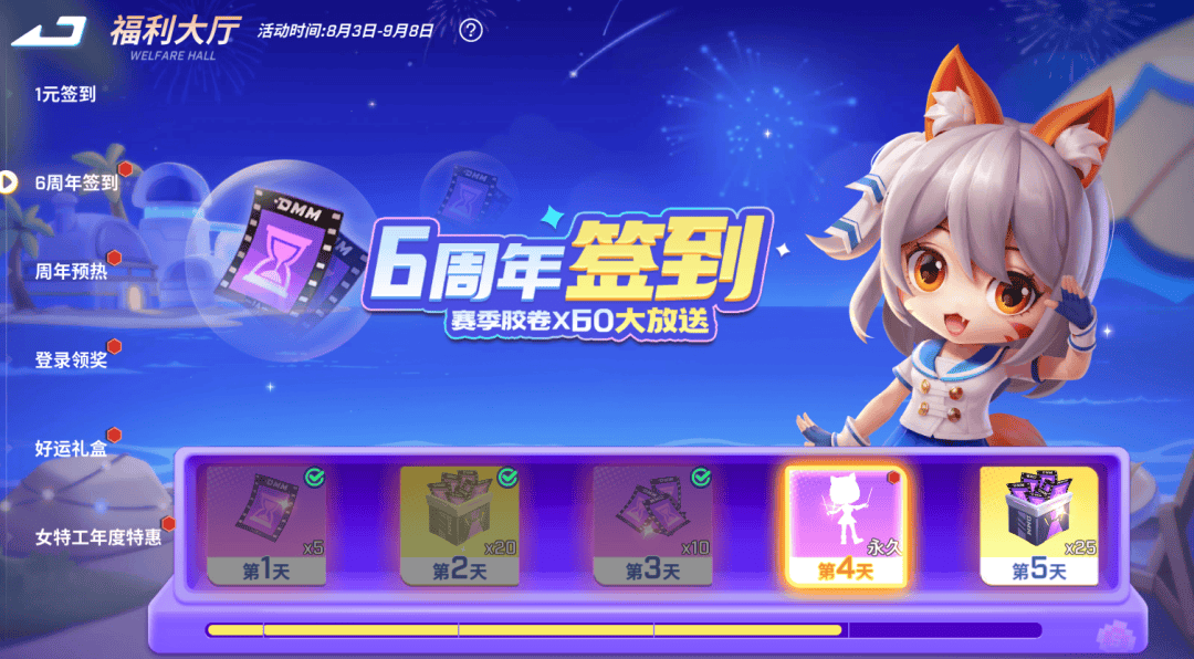 累计签到5日,就可以抱走赛季胶卷*60和艾可的6周年庆生动作喔~