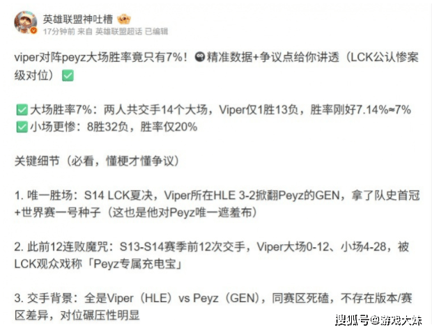 从纯数据角度看,Viper对阵Peyz的交手记录,确实堪称LCK级别的名场面反向教材,14个大场1胜13负,小场8胜32负,这不是样本太小,也不是偶然波动,而是跨越两个赛季、长期存在的压制关系,尤其是在同赛区、同环境、同版本体系下反复对位,很难用“水土不服”或者“战术不适配”来解释,这也是为什么LCK观众会调侃Viper是“Peyz充电宝”。