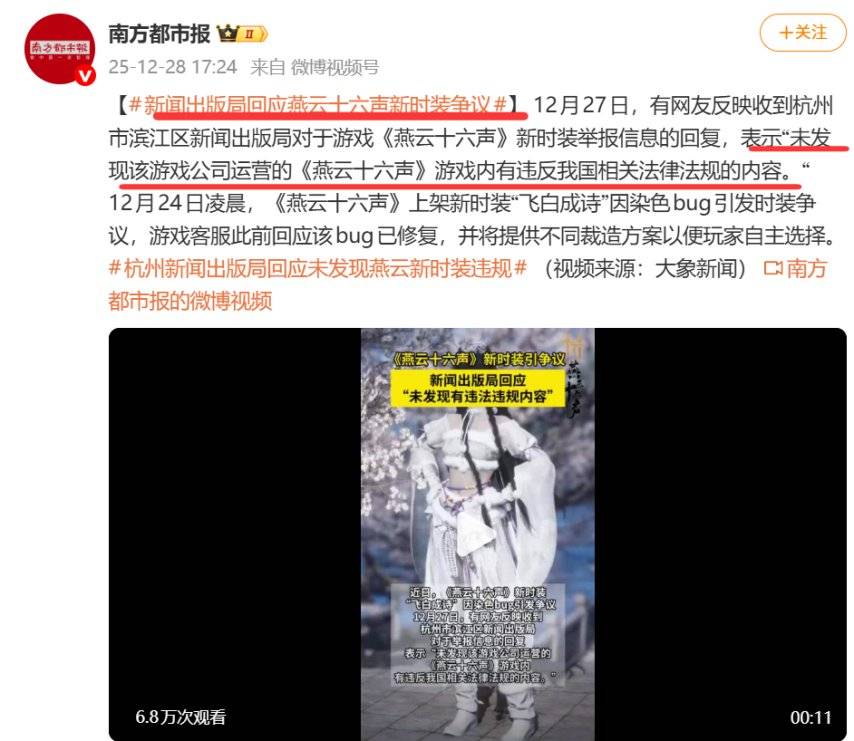 28日,杭州新闻出版局表示:未发现《燕云十六声》有违反法律法规的内容,也算是给这个事情来了“结案”。