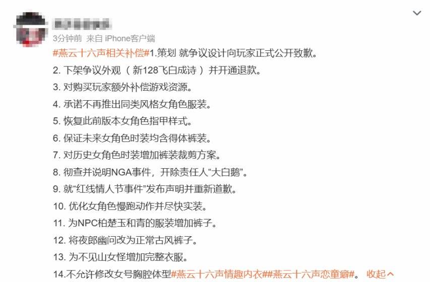 于是,不少女玩家对此表达了不满并疯狂举报,理由是游戏主控角色设定为16岁未成年,此类服饰设计显然触碰了的红线,集体呼吁官方下架时装、退款并公开道歉,这波舆论直接把《燕云十六声》给顶上了热搜。