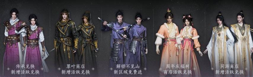 除了可以白嫖比较高档的258时装,这次新版本,玩家还可以拿到5套新时装,分别可以通过传承兑换、罪叶商店、周年庆福利商店、同游商店的新增活跃兑换,还有一套可以通过解锁不见山新区域免费送。