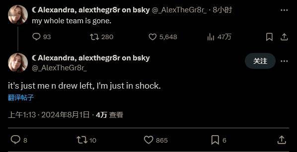 玩家支持分析师 Alexandra 在推特上发帖道:“我的整个团队都被裁了。”随后补充道只有自己和另一名员工留存。