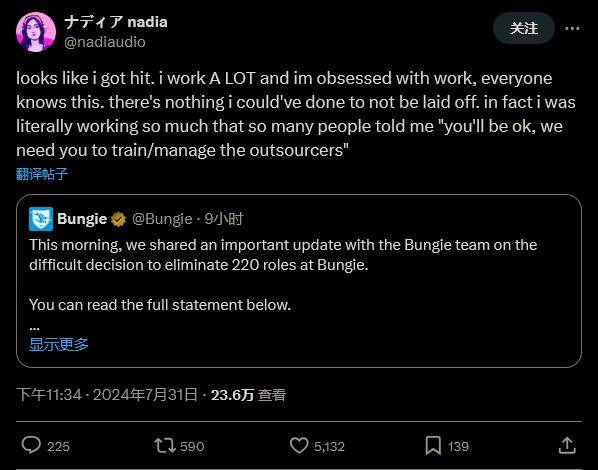 甚至连一些非常重要的人员也被解雇了。为 Bungie 制作音乐的 Nadia 表示:“我对自己被解雇这件事无能为力。事实上,我所涵盖的工作量之大,很多人告诉我‘你没事的,我们需要你来训练/管理合同工。’”然而她仍然被解雇了。